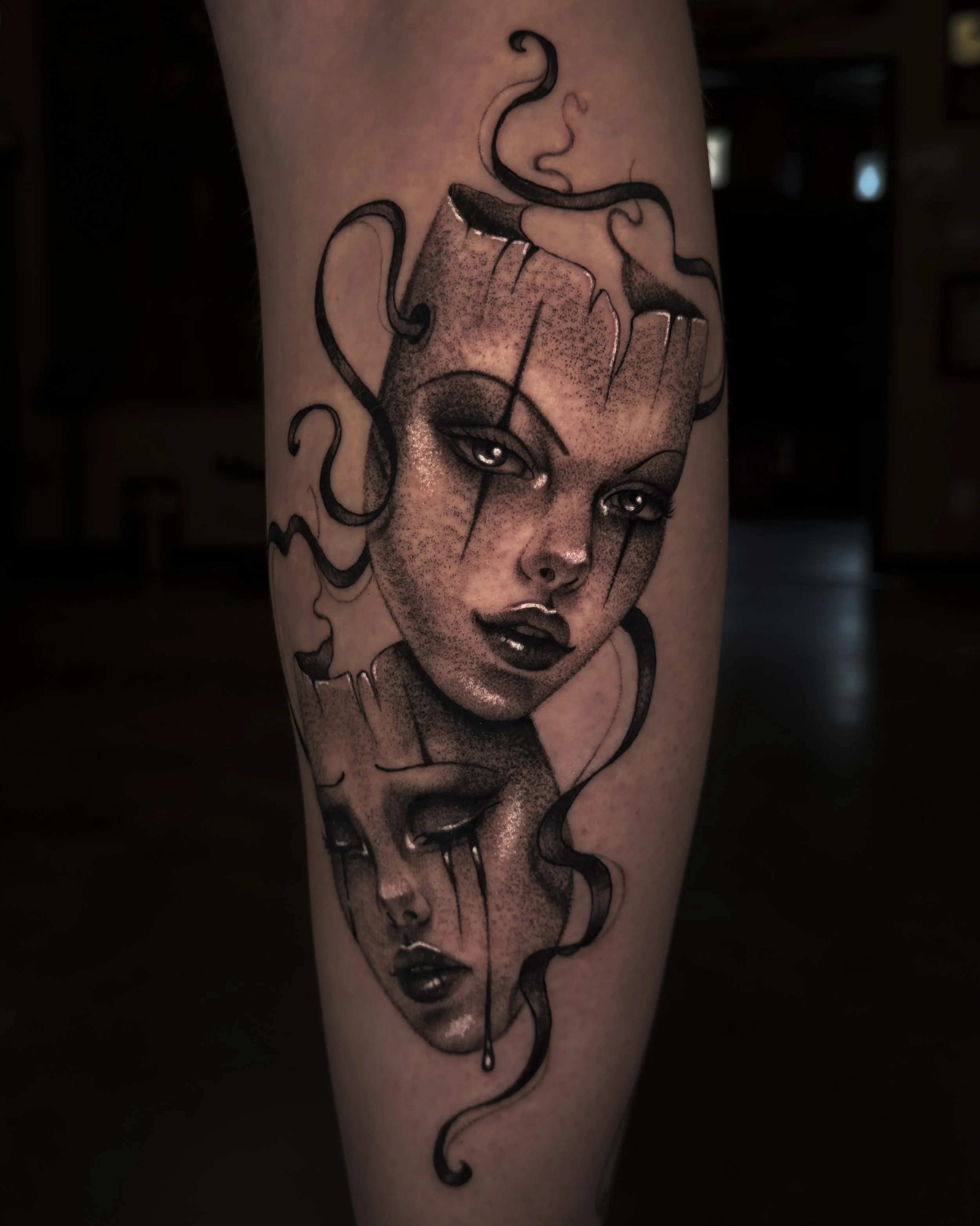 I am a Colombian tattoo artist specializing in black and grey. I moved to Canada in August 2023, where I proudly call Moose Jaw, Saskatchewan my home and where I devote myself to crafting tattoos that blend elements of the eerie and the endearing.