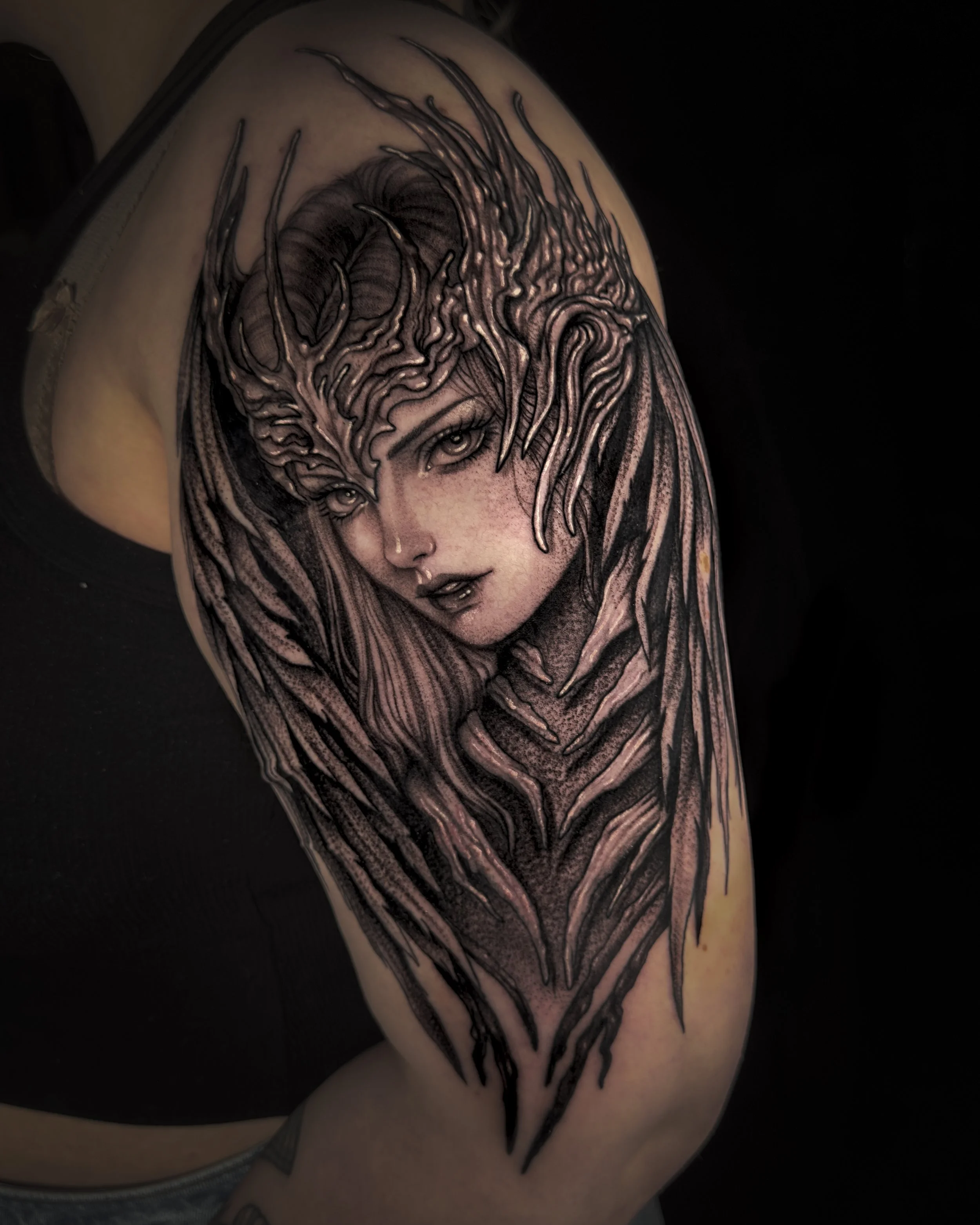 I am a Colombian tattoo artist specializing in black and grey. Inspired by my passion for travel, I moved to Canada in August 2023, where I proudly call Moose Jaw, Saskatchewan my home. At Bloodline Tattoo Company, under the mentorship of Chet Spriggs, I devote myself to crafting tattoos that blend elements of the eerie and the endearing.